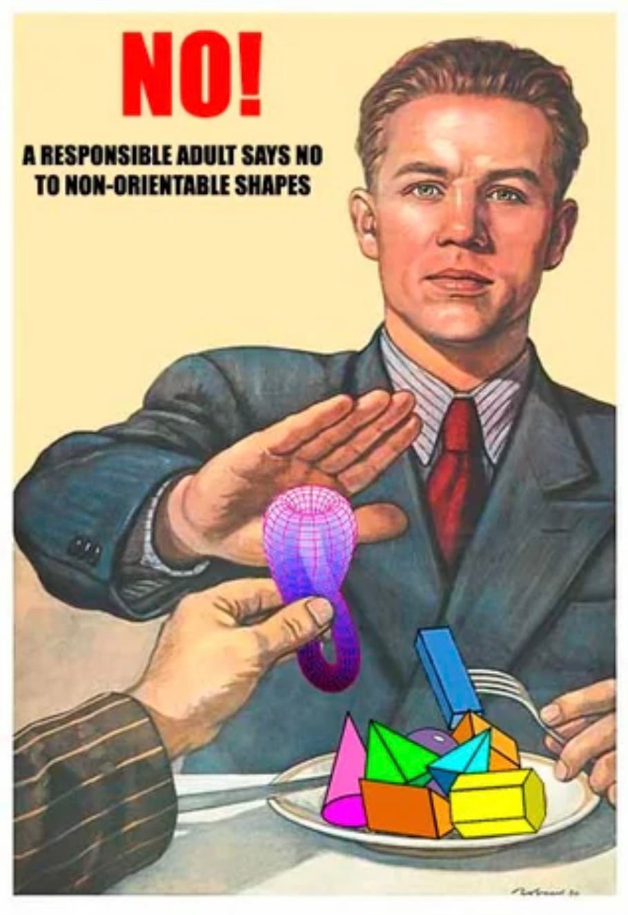 Janna Levin, a brilliant writer and cosmologist, has possibly the best description of this I’ve seen to date.1 She explains that when an object moves around a circle, it comes back as the same object. A right-handed glove that makes a full trip will always return a right-handed glove. Now take that same object and move it along a Möbius strip, and it will return the mirror image of itself. A transformation arc: the right-handed glove goes on a journey, and by some shapely magic, returns to where it began, left-handed.2