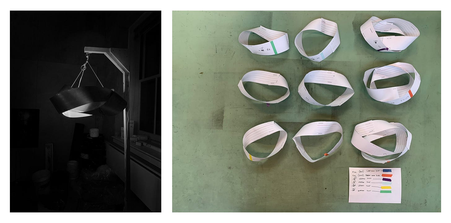 It was around the beginning of grad school that the Möbius came to me. I was loosely aware of it, although it took another major milestone–the role of fabrication–in my own personal narrative structure to bring it to prominence. It’s in my nature to make, and studying architecture was more of a consolidation of many other skills into a focused career path. While my peers honed their professional skills and gained a working understanding of useful things like building codes and curtain wall systems, I was making loops. Möbius loops, to be specific.